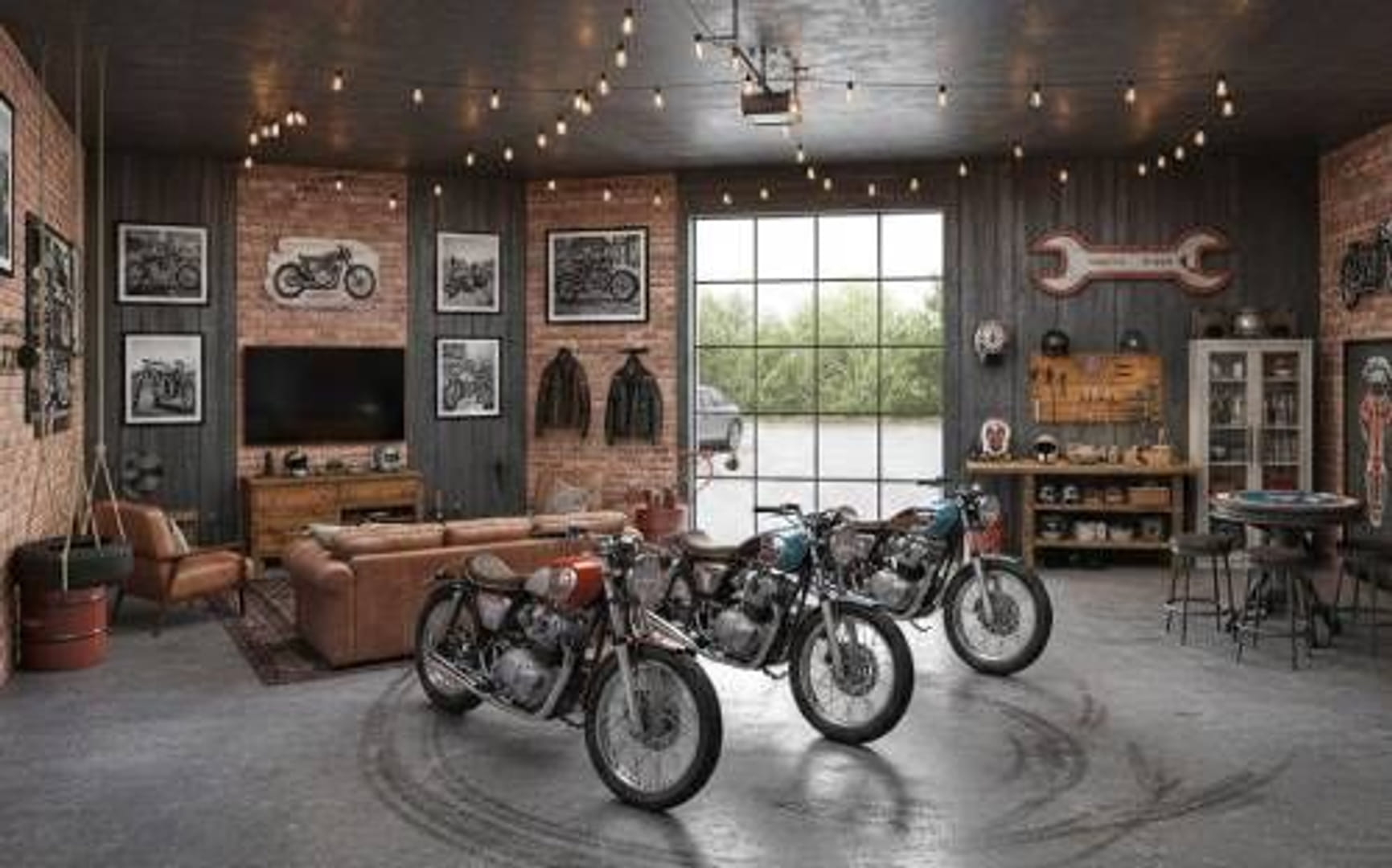 Muitos motociclistas transformam a garagem em um espaço de convivência. Bancos, poltronas, sofás compactos ou até um pequeno balcão criam um ambiente ideal para receber amigos.