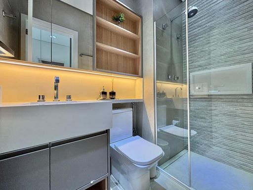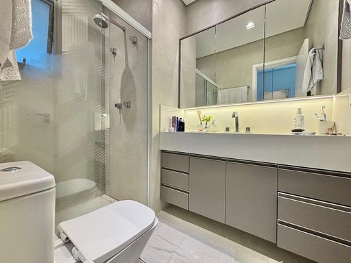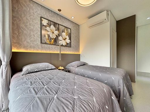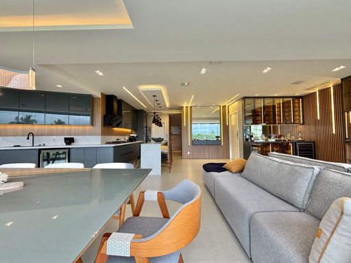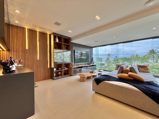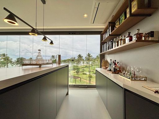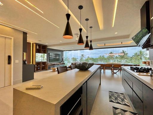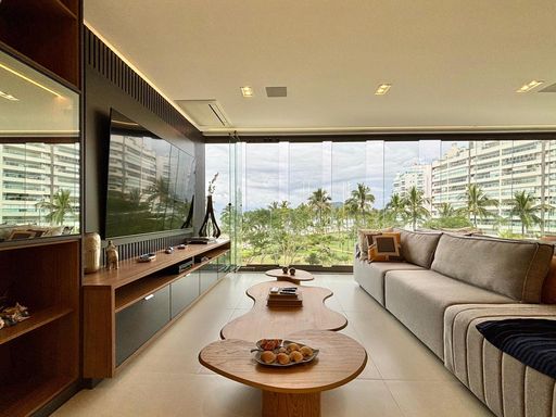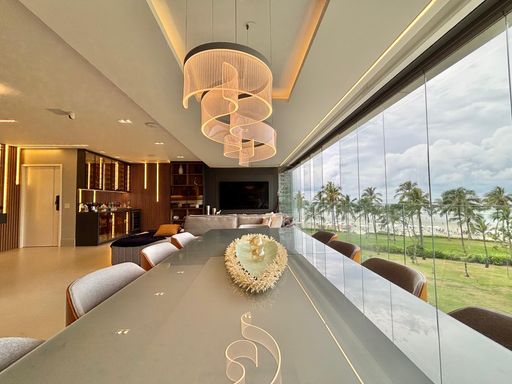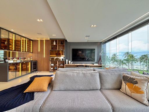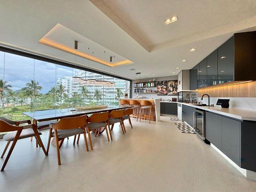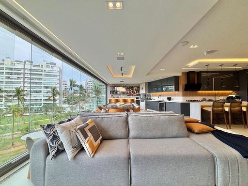 Com 239,08 m² de área privativa, o apartamento conta com ambientes amplos, mobiliário impecável e decoração sofisticada, pronto para morar. O terraço nivelado à sala proporciona integração total com a área social, vista mar frontal e acesso direto à área gramada, reforçando o conceito de luxo e bem-estar em um dos endereços mais valorizados do litoral paulista.