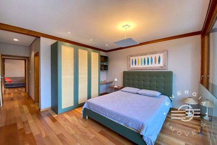 • Suíte master com cama de casal, sofá, TV e armários planejados
