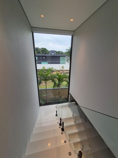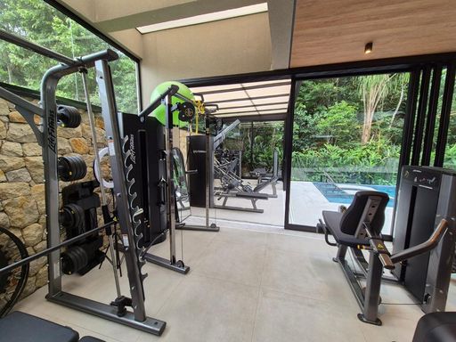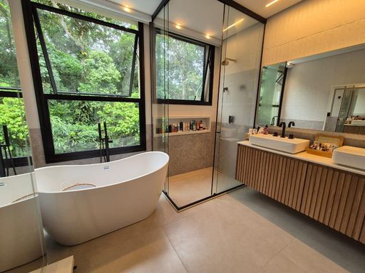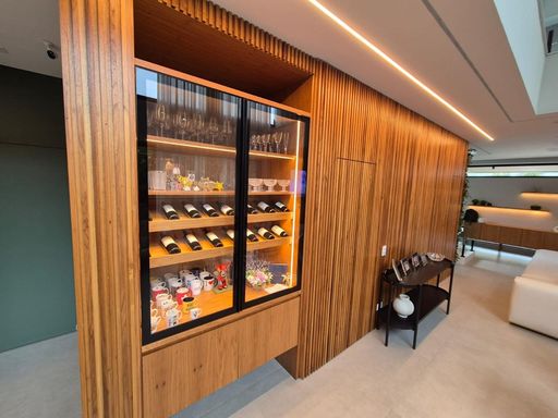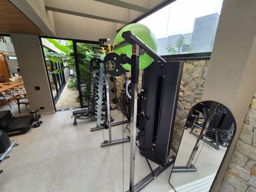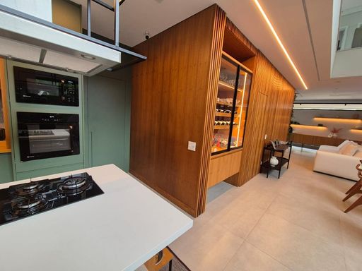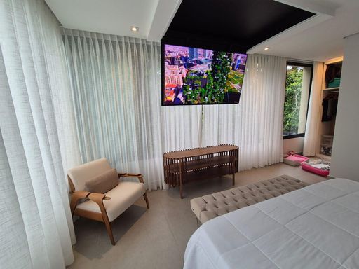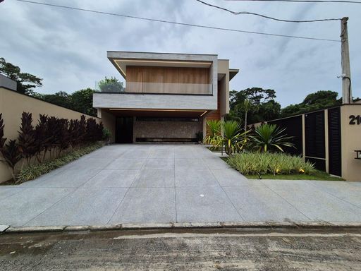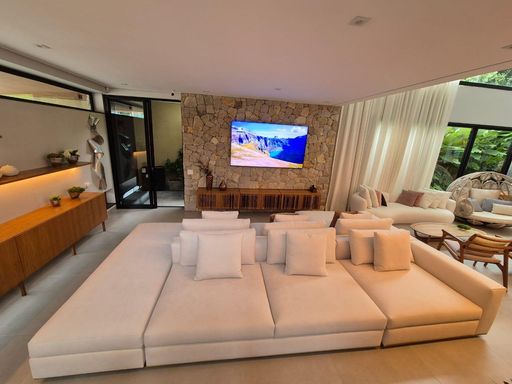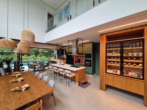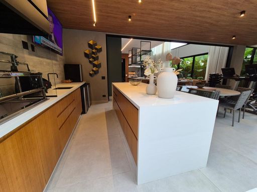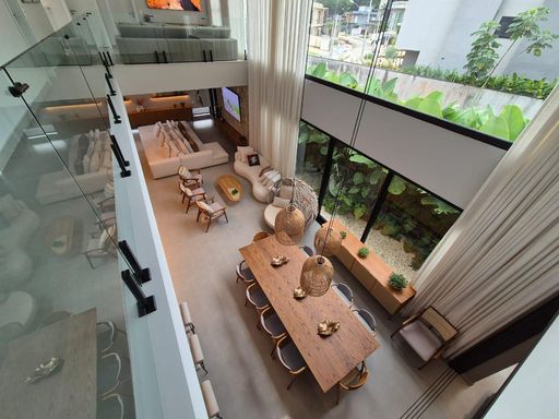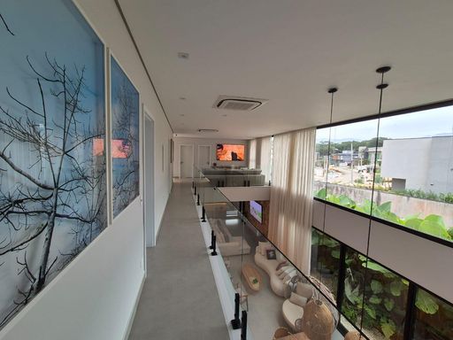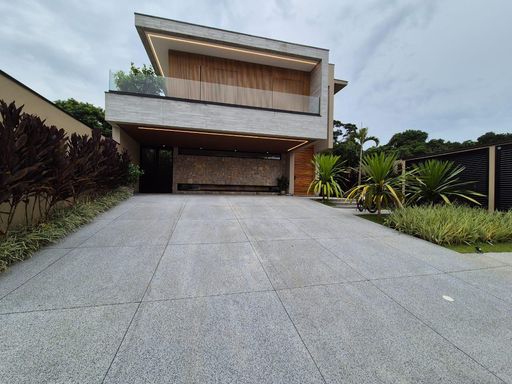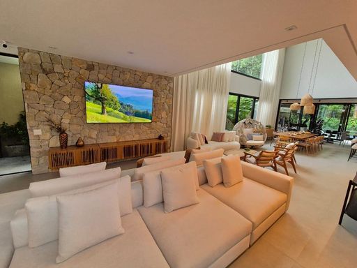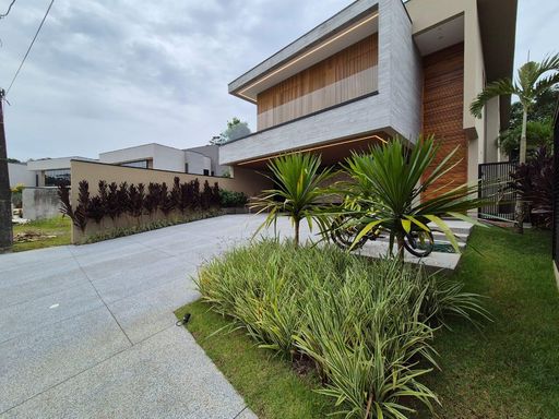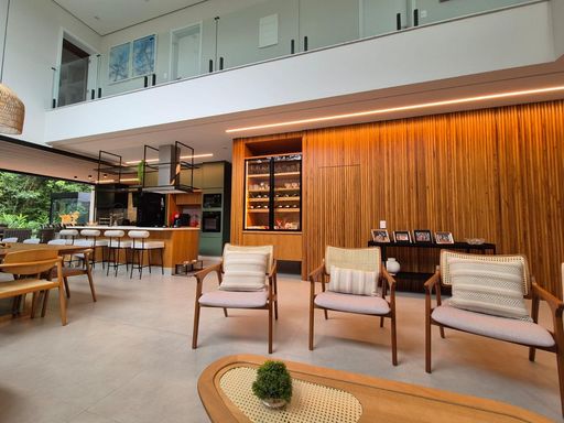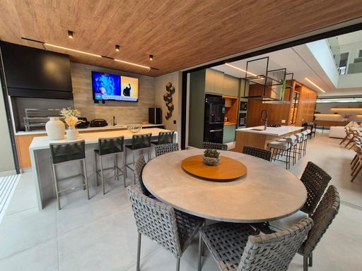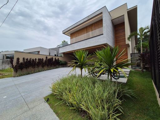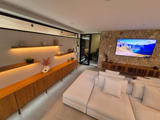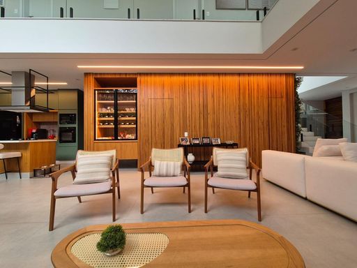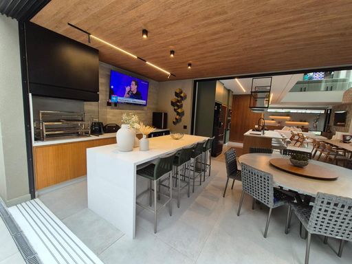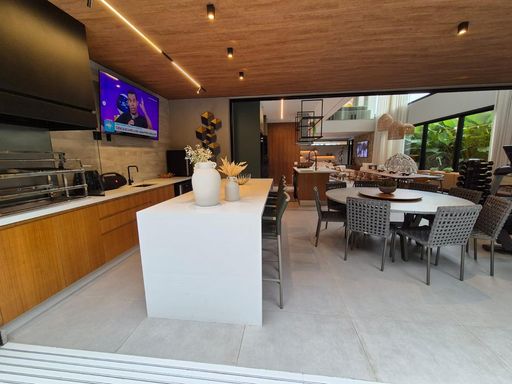 Casa espetacular com 450m² de construção em terreno de 501m², 6 suítes (incluindo suíte master com closet, banheira e vista para área verde), sala living, sala de jantar, sala de TV, cozinha equipada com ilha, adega, sauna e piscina aquecida. Amplo espaço gourmet com churrasqueira, pergolado e hidromassagem. Todos os ambientes climatizados com ar condicionado central, pé-direito duplo, 6 vagas de garagem e tomada para veículo elétrico.