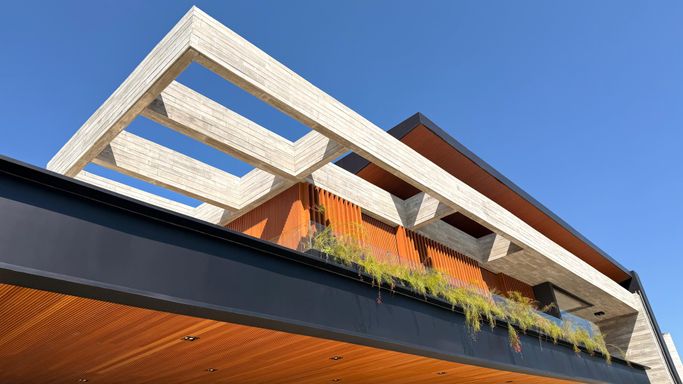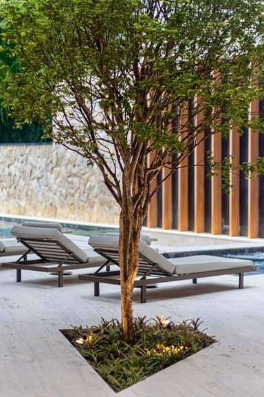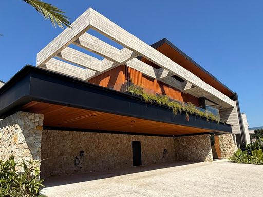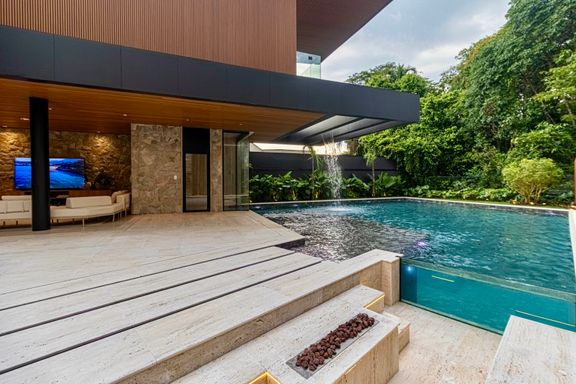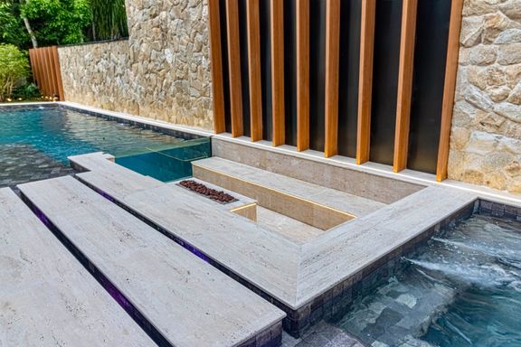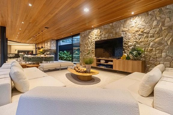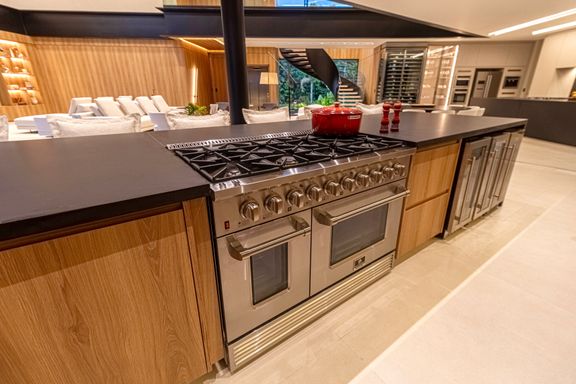 - Decorada com mármore Travertino Romano e Dekton